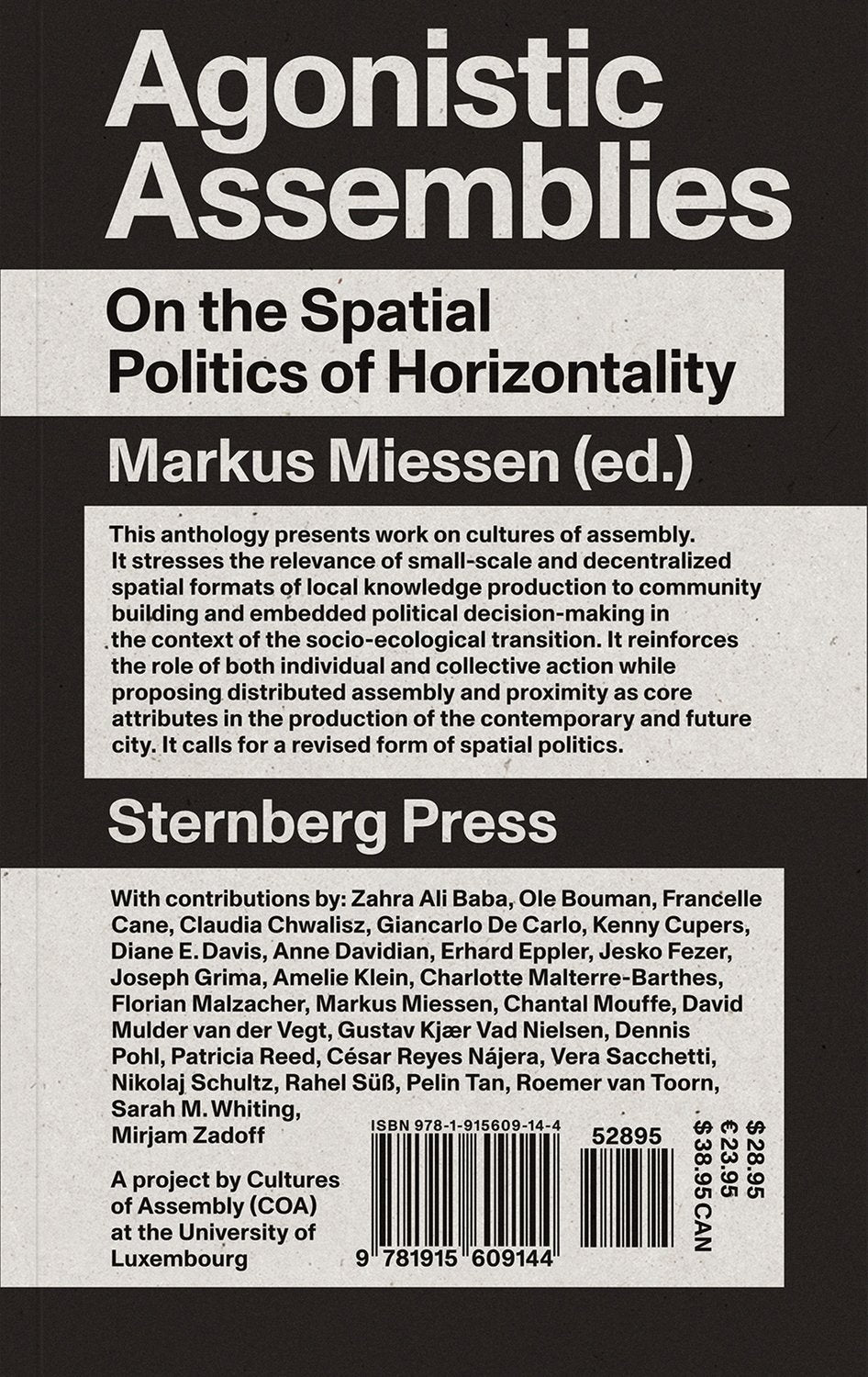 This anthology presents work on cultures of assembly. It stresses the relevance of small-scale and decentralized spatial formats of local knowledge production to community building and embedded political decision-making in the context of the socio-ecological transition. It reinforces the role of both individual and collective action while proposing distributed assembly and proximity as core attributes in the production of the contemporary and future city. It calls for a revised form of spatial politics.