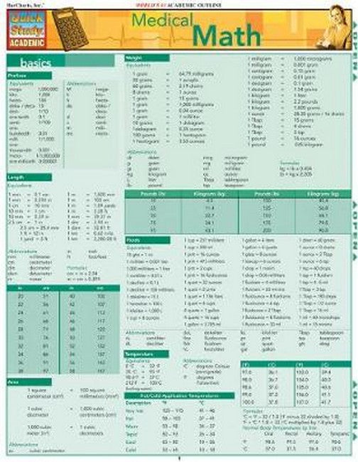 Calculations, formulas, measurements, conversions, dosages, rates, equivalents and more are expertly organized in this 6 page laminated reference guide with clear color coded sections and easy to read layout. You can find your answer fast as a medical professional or a medical student on the job or in the classroom. Author Dr. Shelley C. Safian is a professor and author of six textbooks and multiple best selling QuickStudy reference guides. Topics covered include: Measurement Basics Calculations & Formulas Apothecary System Laboratory Measures Reimbursement Calculators Health-Care Operating Indicators Coding Measurements Burns -- Adults, Children, Infants Coding Excision of Lesions, Laceration & Wound Repair Pediatric Definitions Dosage Calculators Expected Growth Rates APGAR Scoring for Newborns Clinical Indicators Respiration, Blood Pressure, Cardiac Output, Stroke Symptoms, Hemodynamic Parameters, Blood Flow Rate, Mean Arterial Pressure (MAP), Body Mass Index (BMI), Cardiac Assessment Vital Signs Table by Age Pressure Ulcer Risk Assessment Pulse Rates by Age & Pulse Volume Variations Pain Scale, Aldrete Score/Postanesthetic Recovery Score, Electrolytes & Imbalance Levels & Calculations, Arterial & Venous Blood Normal Values, Dosage Calculations, Arterial Blood Gases: Normal Values, Edema Rating Scale, Deep Tendon Reflexes Grading, Muscle Strength, Body Surface Area Intravenous Drip & Flow Rates Needle Lengths & Gauges Lung Volume & Capacities, Respiratory Management Home Health Care Group Severity Levels Heart Failure Classifications Glasgow Coma Scale Trauma Score Titration Table
